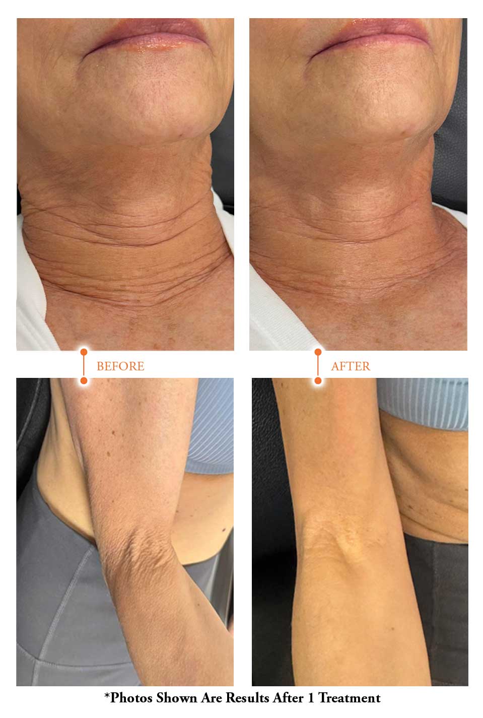 Exclusively available at Recovery One, this groundbreaking facial is the only one of its kind in the world. Developed by a University of Texas scientist in collaboration with a top skincare formulator, it combines a proprietary topical with our advanced infrared laser to trigger collagen synthesis and deep cellular repair. Clients see real results after just one session. Crepey skin visibly smooths, fine lines soften, and the neck looks noticeably firmer and more youthful. This non-invasive, pain-free treatment is safe and effective for the face, neck, hands, arms, and legs, making it the perfect reset for tired, aging, or sun-damaged skin.